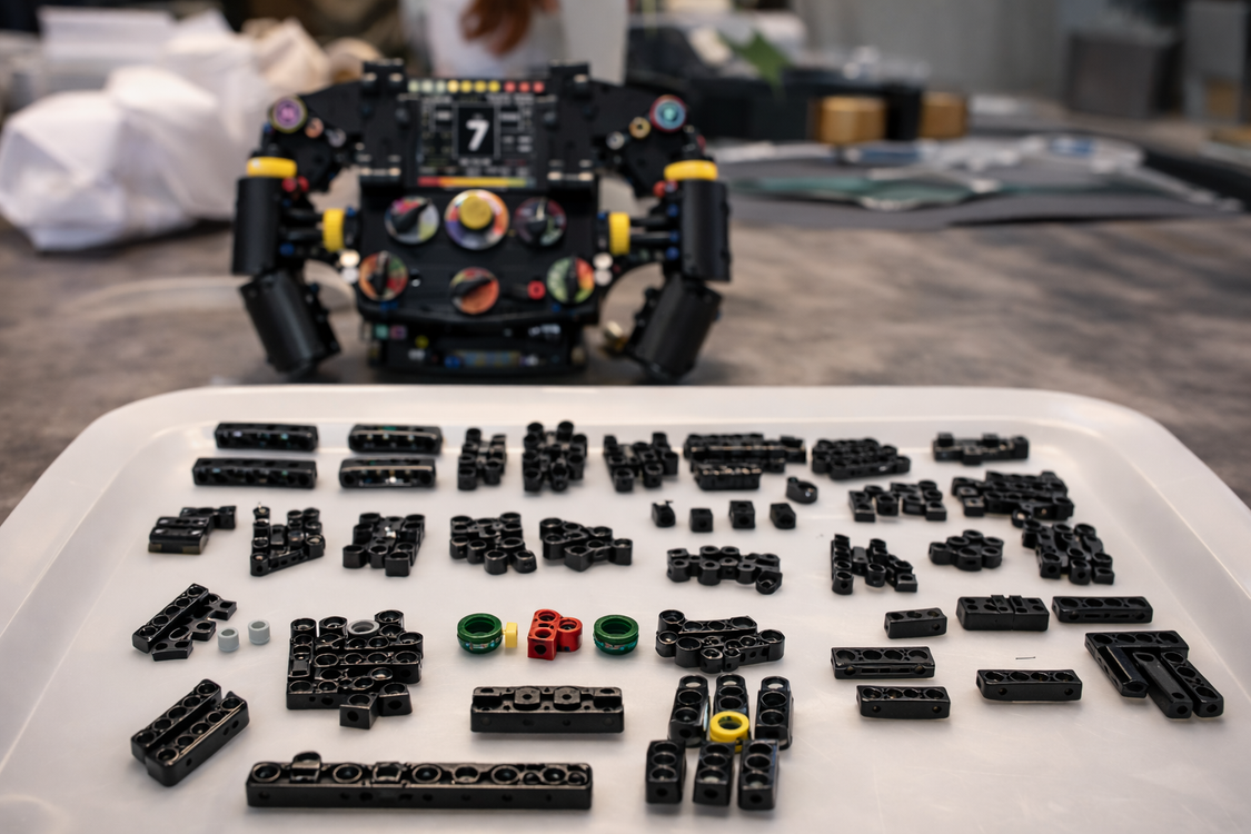 This kit includes 849 high-precision ABS building blocks to create your steering wheel.